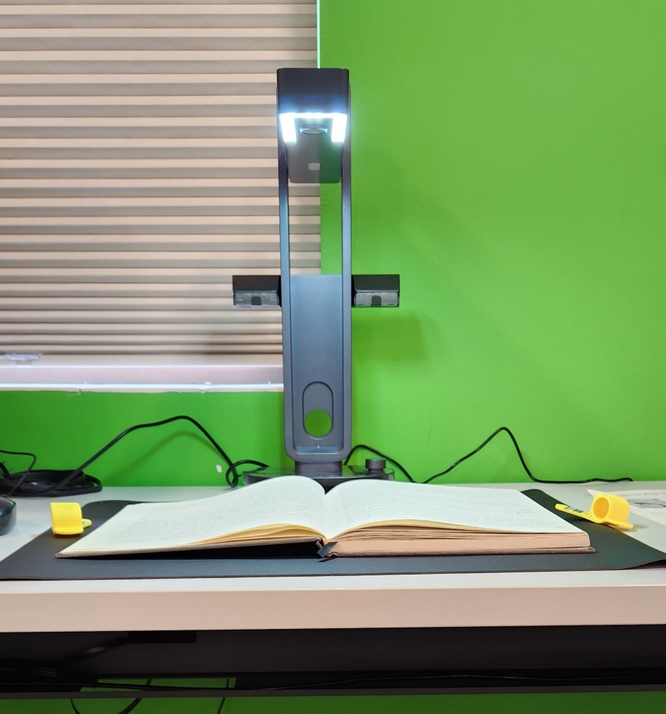 The CZUR Aura Pro book and document scanner can scan text documents and books such as personal journals. For document scanning, the scanner locates the documents on its scanning mat without requiring precise document placement. For scanning books, the operator aligns the center of the open page on the scanning mat. The scanner makes a preliminary scan with three laser beams, measuring the curvature of the pages. It then simultaneously captures the left and right pages and uses proprietary