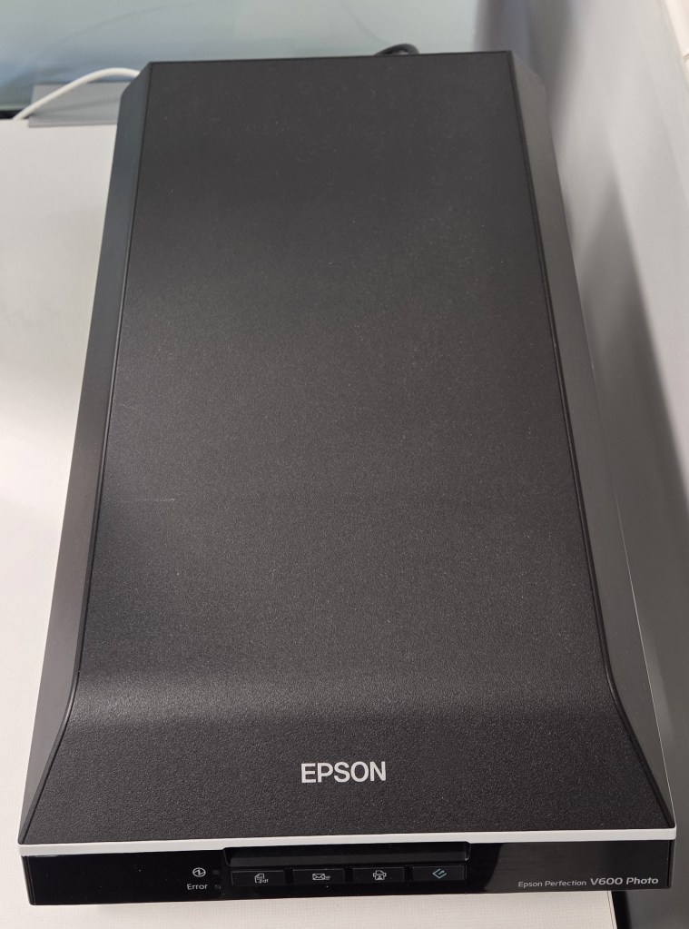 Epson Perfection V600 Photo Flatbed Scanner scans photos. After reconfiguration with a film adapter, it can medium format negatives, 35 mm slides and negatives.